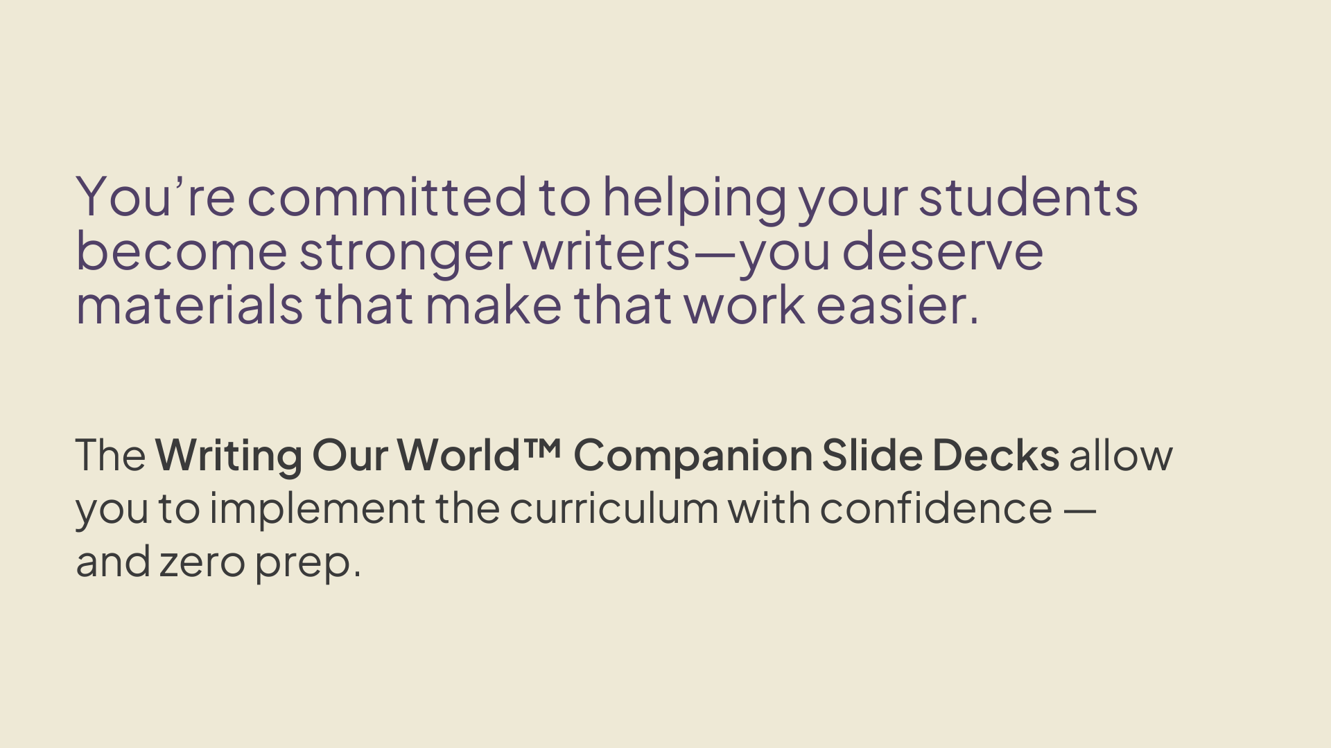 Companion slide decks for every lesson of Steps 1 & 2 of Writing Our World™. These decks cover: